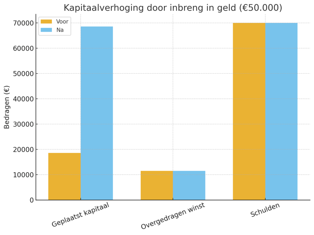 - Voorbeeld: vóór de kapitaalverhoging stond er €50.000, na de verhoging €150.000.