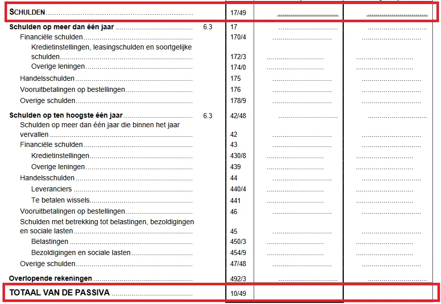 De kolom links (“boekjaar”) geeft de situatie weer van het laatste boekjaar. De kolom ernaast (“vorig boekjaar”) slaat op de cijfers van vorig jaar. Net als op het actief is het dus heel eenvoudig om het huidige jaar te vergelijken met het vorige in de kolom er vlak naast.