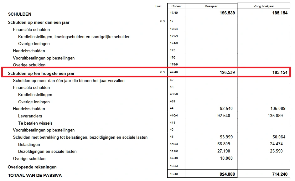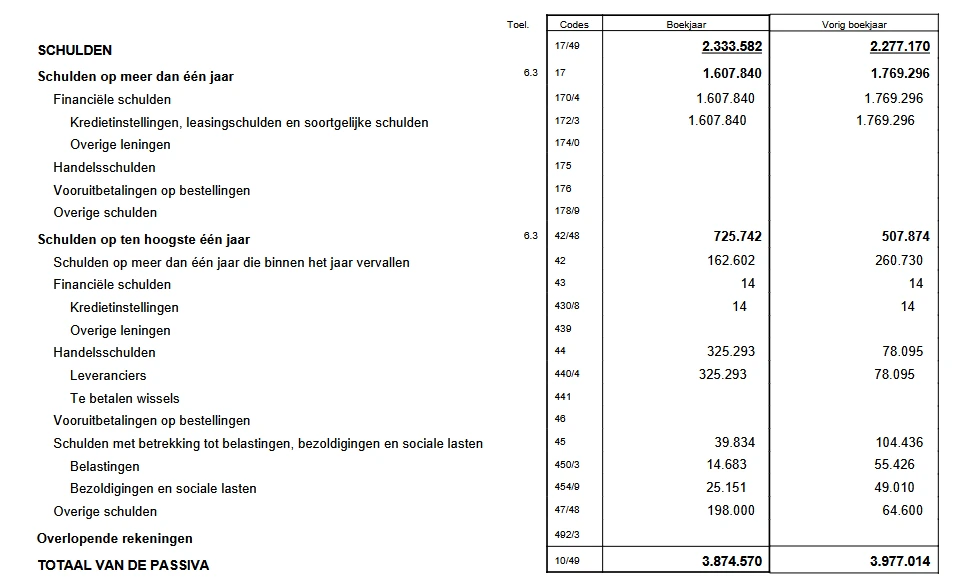 2.We bekijken het passief van de balans. De schulden op ten hoogste één jaar bedragen in dit bedrijf 725.742 EUR.