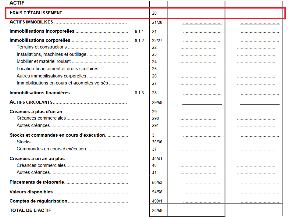 Particularité belge : les frais d’établissement n’apparaissent à l’actif du bilan que s’ils sont activés et amortis sur plusieurs exercices. S’ils sont entièrement pris en charges immédiatement, ils figurent uniquement dans le compte de résultats.