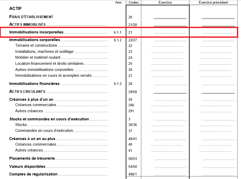 Elles apparaissent dans la rubrique 21, premier sous-ensemble des « actifs immobilisés » situés en haut du bilan, après les frais d’établissement. Les actifs immobilisés, avec les frais d’établissement et les actifs circulants, constituent les trois principales composantes de l’actif au bilan.