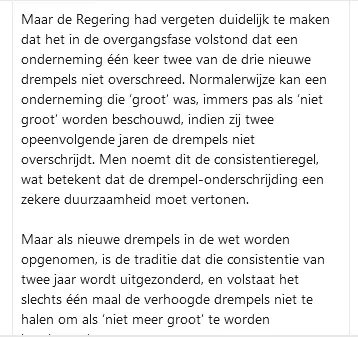 De consistentieregel werd uitgesloten voor de nieuwe groottecriteria van vennootschappen. Eén keer niet voldoen aan de criteria volstaat.