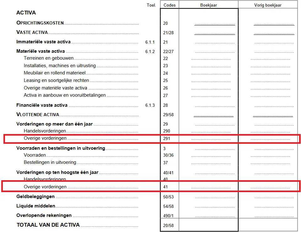 Op Belgische balansen vind je de rekening courant actief onder ‘overige vorderingen’, meestal in post 41 op het actief van de balans: