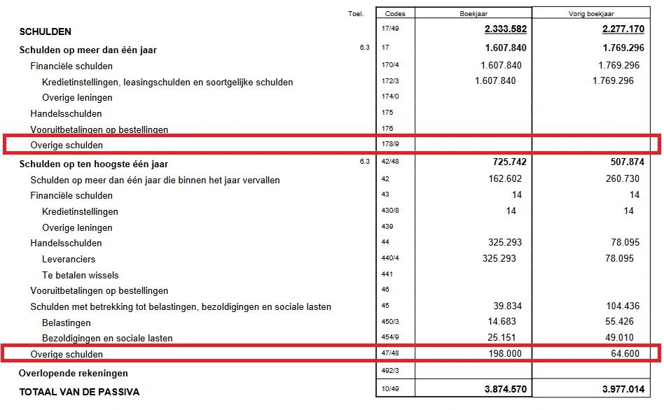 De rekening courant passief vind je onder ‘overige schulden’ op de passiefzijde. Meestal is dit rubriek 47/48 onder de ‘schulden op ten hoogste één jaar’. Maar net zo goed kan de RC passief zich onder rubriek 178/9 onder de ‘schulden op meer dan één jaar’ bevinden: